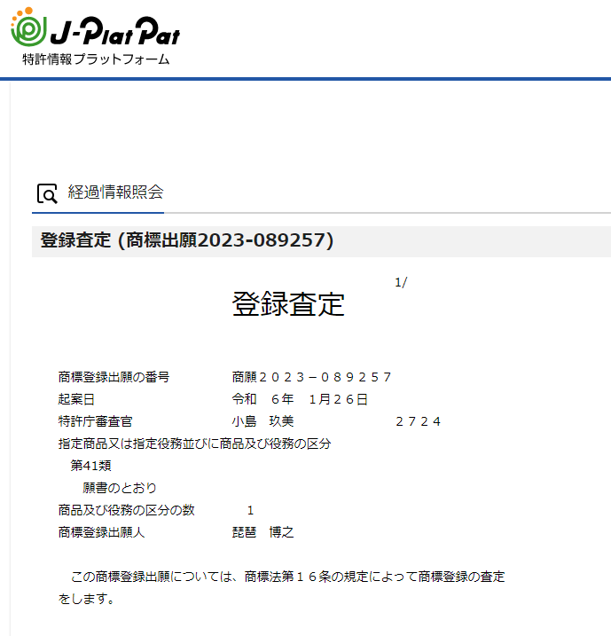 2024年7月28日に商標出願していた「ベストドリーマー」が登録査定できるとの連絡がありました。第41類の指定役務での商標になります。